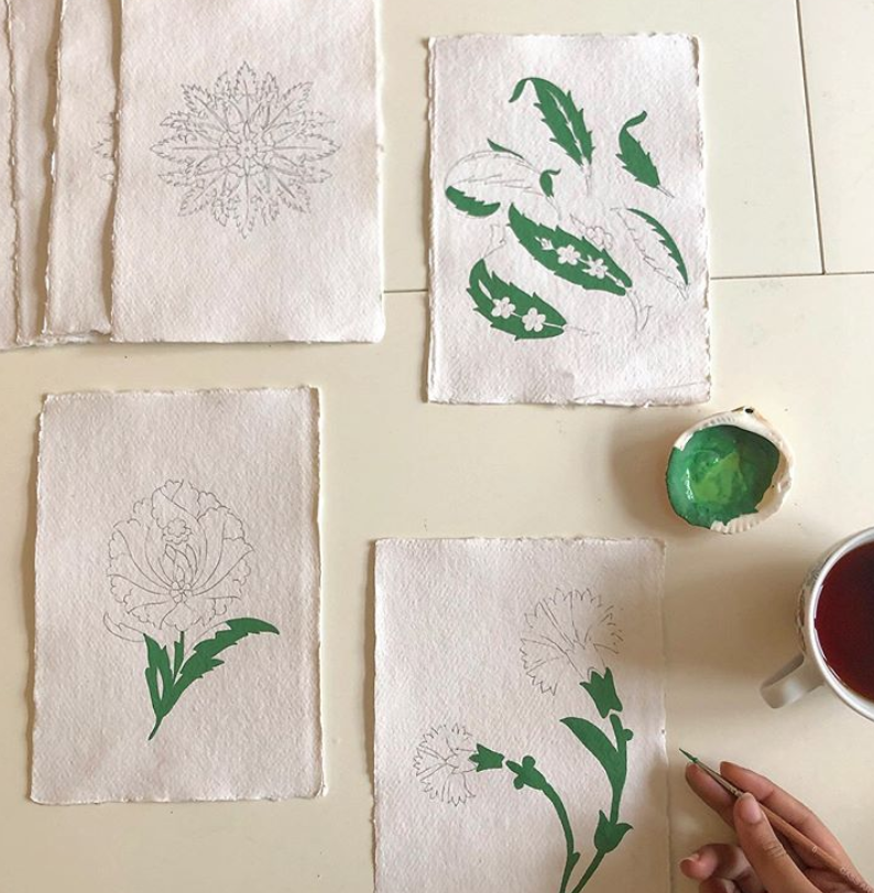 Tools: Printed Flower Design, Tracing Paper, Pencils, brushes, real gold or gouache gold, watercolours and/or gouache colours.